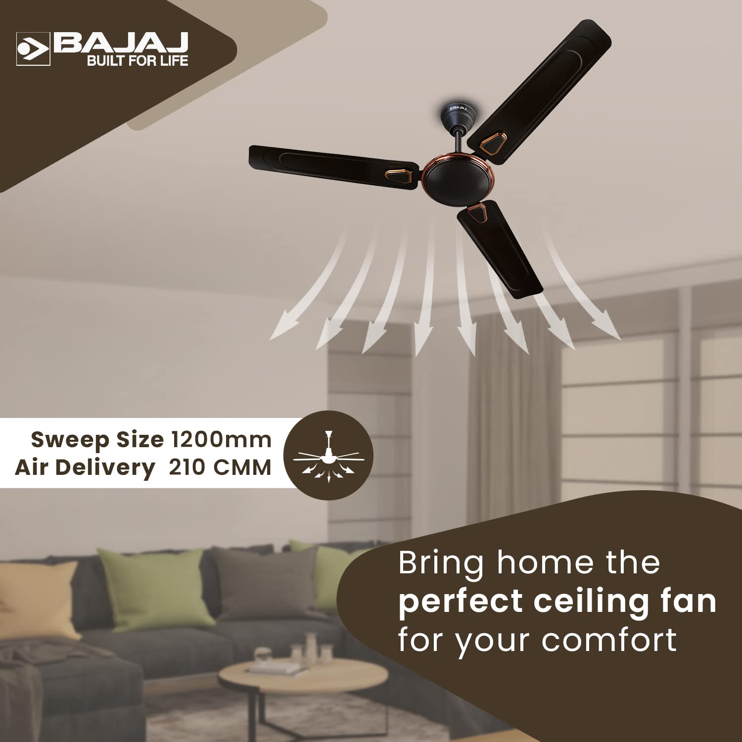 - PRODUCT: Bajaj Edge HS Neo DECO EE 1200mm Choco Brown Ceiling Fan,with 3 blades; SERIES: EDGE HS NEO DECO EE; SWEEP SIZE: 1200 mm; COLOUR: Choko Brown; AIR DELIVERY: 210 CMM; POWER: 52 Watts; RPM: 390.