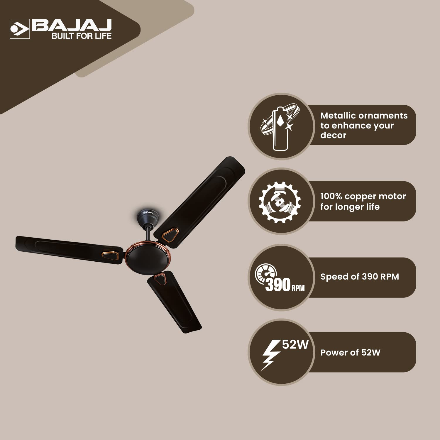 Bajaj Edge HS Neo Deco EE 1200MM (48″) Ceiling Fans For Home | BEE 1 Star Rated Energy Efficient Ceiling Fan | Unique Deco Trims | Rust Free Coating | High Speed | 2-Yrs Warranty 【Choko Brown】