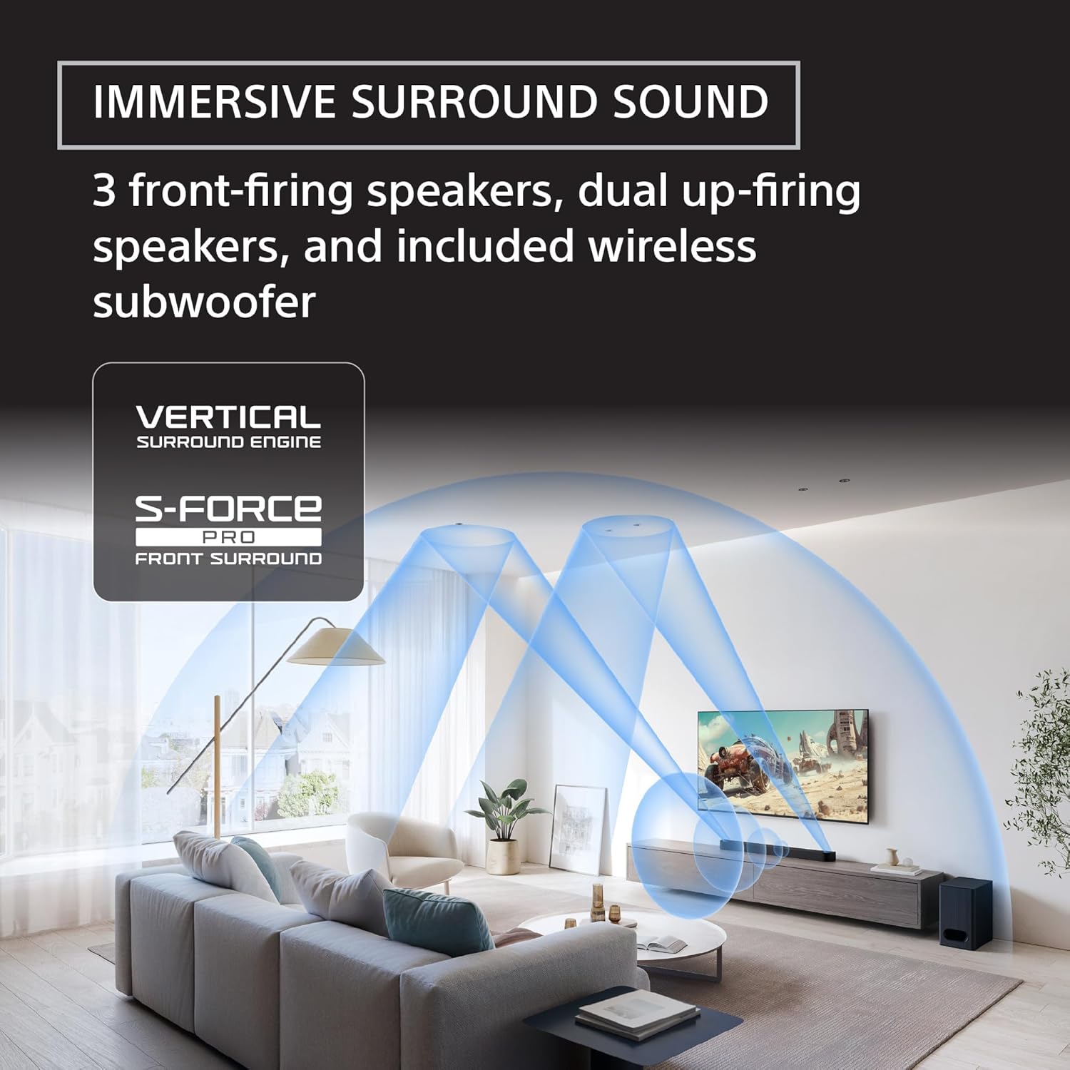 Acoustically designed to deliver cinematic spatial sound with 3 front-firing speakers, including a dedicated center speaker for clear dialogue. Additional dual up-firing speakers bounce sound above you adding an elevated dimension to your movies. Included wireless subwoofer for rich, powerful bass.