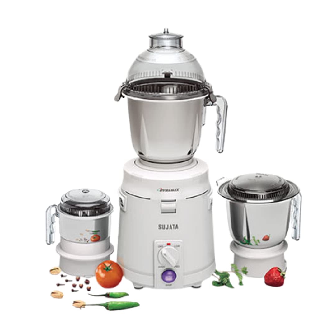 Sujata Dynamix is a practical and compact option for everyday kitchen needs. It has 3 stainless steel jars for varied applications. The Dome jar is for tough wet grinding like Idly paste, while the other 2 jars are for dry grinding and chutney grinding.